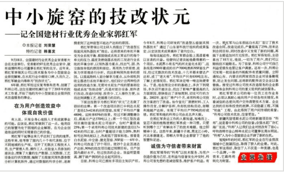 這在今天超產20%已經成為常態的情況下,當年就是一項奇跡;后來又繼續采用更先進的“N-MFC”分解爐技術技術,使這條生產線在仍然沒有擴大預熱器規格,沒有更換高溫風機的情況下,達到了1100t/d產量的生產能力。這些成績被中國建材報以“中小旋窯改造狀元”和”把成熟技術做到極致就是絕招“為題目分別做了詳細報道。并在國內水泥行業再次掀起了中小型旋窯改造之風,當時行業內流傳著“旋窯改造都可干,想要更好找科邦”的說法。“科邦技術好,科邦的服務更好的”也成為當時一些企業的共識;他們對大、中、小旋窯技改成績同時也得到了原國家建材局局長王燕某、副局長李儉之和中國水泥協會等領導的充分肯定。并親臨改造現場進行考察。