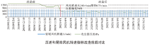 收入收塵器進(jìn)、出風(fēng)口壓差大幅減小,尾排風(fēng)機(jī)運(yùn)行轉(zhuǎn)速也有一定幅度的降低,風(fēng)機(jī)電耗也是有所降低;