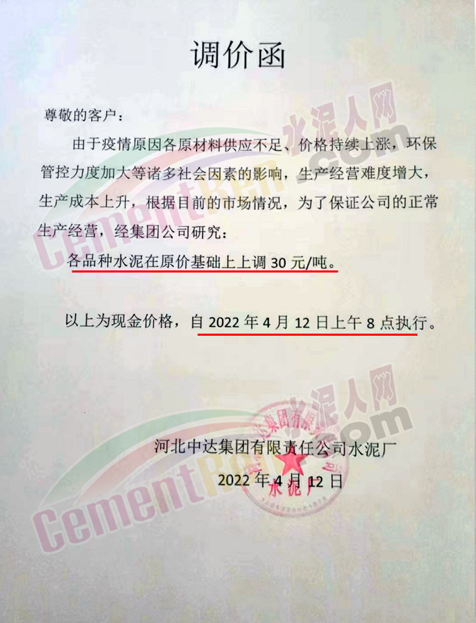 河北中達集團有限責任公司水泥廠通知由于疫情原因各原材料供應不足,價格持續上漲,環保管控力度加大等諸多因素影響,生產經營難度增大,生產成本上升,為保證公司的正常生產經營,各品種水泥自4月12日上午8時在原價基礎上上調30元/噸。