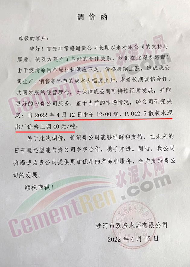 沙河市雙基水泥有限公司通知,由于疫情原因各原材料供應不足,價格持續上漲,造成公司生產,銷售等環節的成本大幅度上升,為保障公司可持續經營發展,鑒于當前的市場情況,經公司研究決定自4月12日中午12時起,P.O42.5散裝水泥出廠價格上調40元/噸。