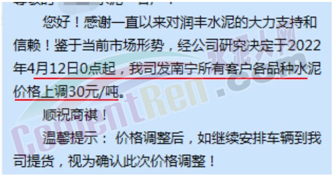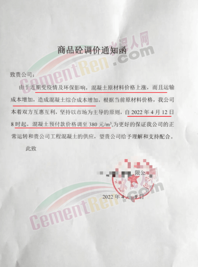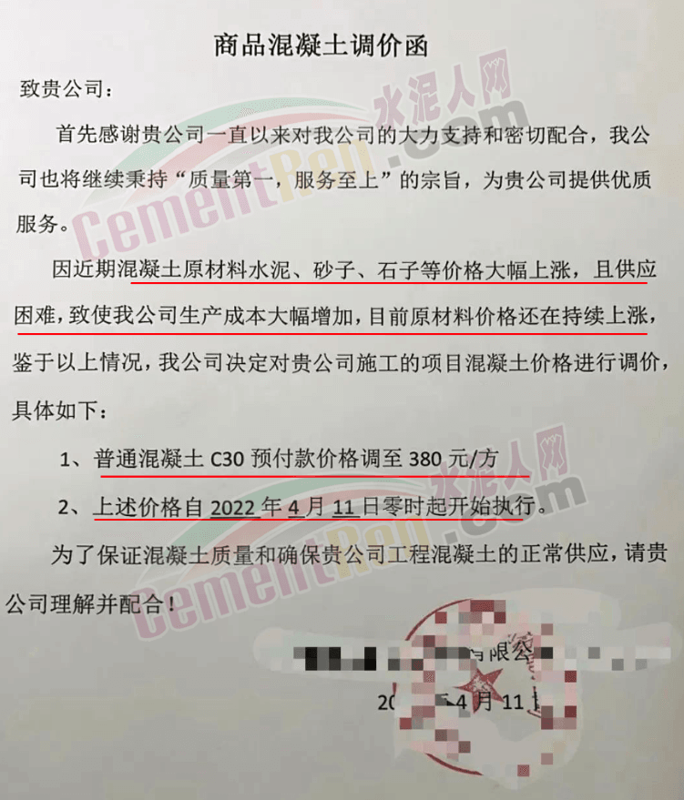 另一企業調價通知提到,原材料價格持續上漲,造成混凝土成本大幅上漲,公司通過內部控制挖潛已經無法克服原材料持續上漲帶來的成本壓力,為確保混凝土質量,滿足供應,經過多方面考慮,決定自4月12日起上調價格30元/立方。