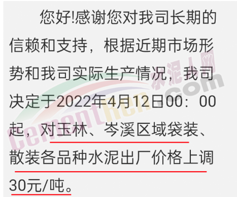 廣西玉林、貴港、北海、南寧等多區域主要品牌企業通知水泥價格上調30元/噸。