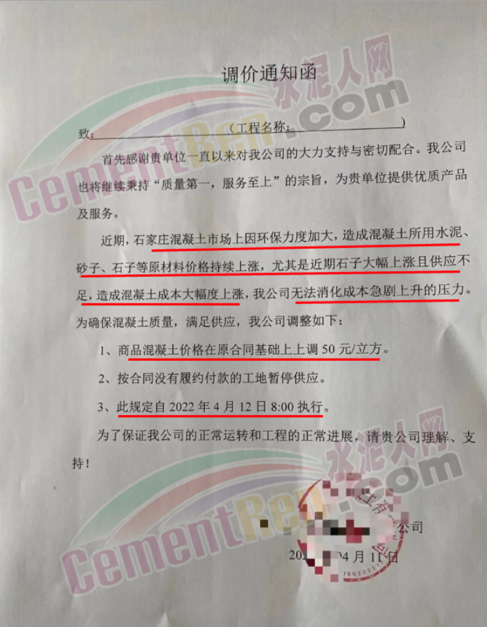 一企業通知函稱,近期石家莊混凝土市場上因環保力度加大,造成混凝土所用水泥、砂子、石子等原材料價格持續上漲,尤其是近期石子大幅上漲且供不應求,造成混凝土成本大幅度上漲,公司無法消化成本急劇上升的壓力,為確保混凝土質量,商品混凝土價格從4月12日8時起在原合同基礎上上調50元/立方。