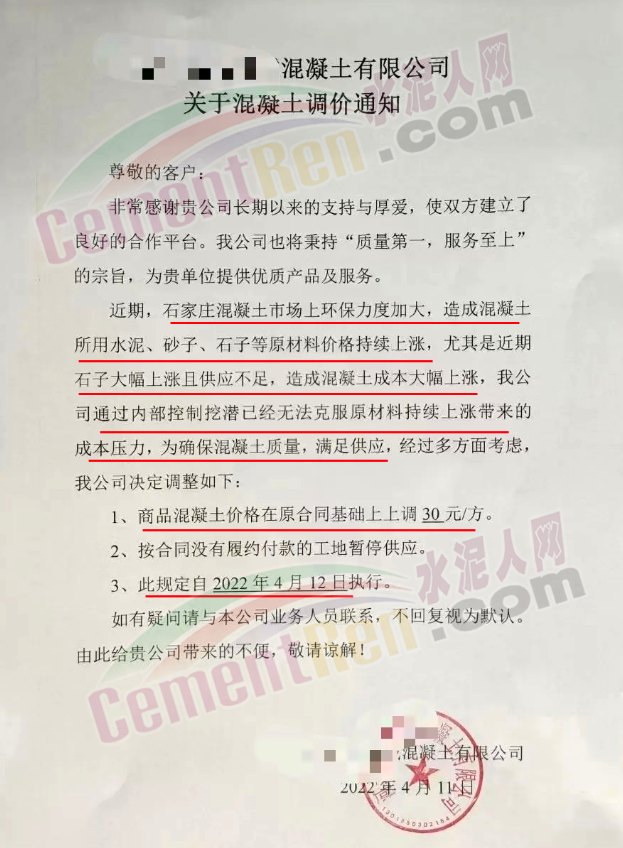 另一企業通知稱,近期因環境治理問題,石家莊市砂石料場限制開采,造成混凝土原材料價格大幅上漲,且供應困難,柴油價格大幅度上漲,致使公司生產成本大幅增加,鑒于以上情況,公司決定自4月11日起普通混凝土C30預付款價格調至380元/立方。其他標號的商品混凝土在原合同基礎上作相應調整 。