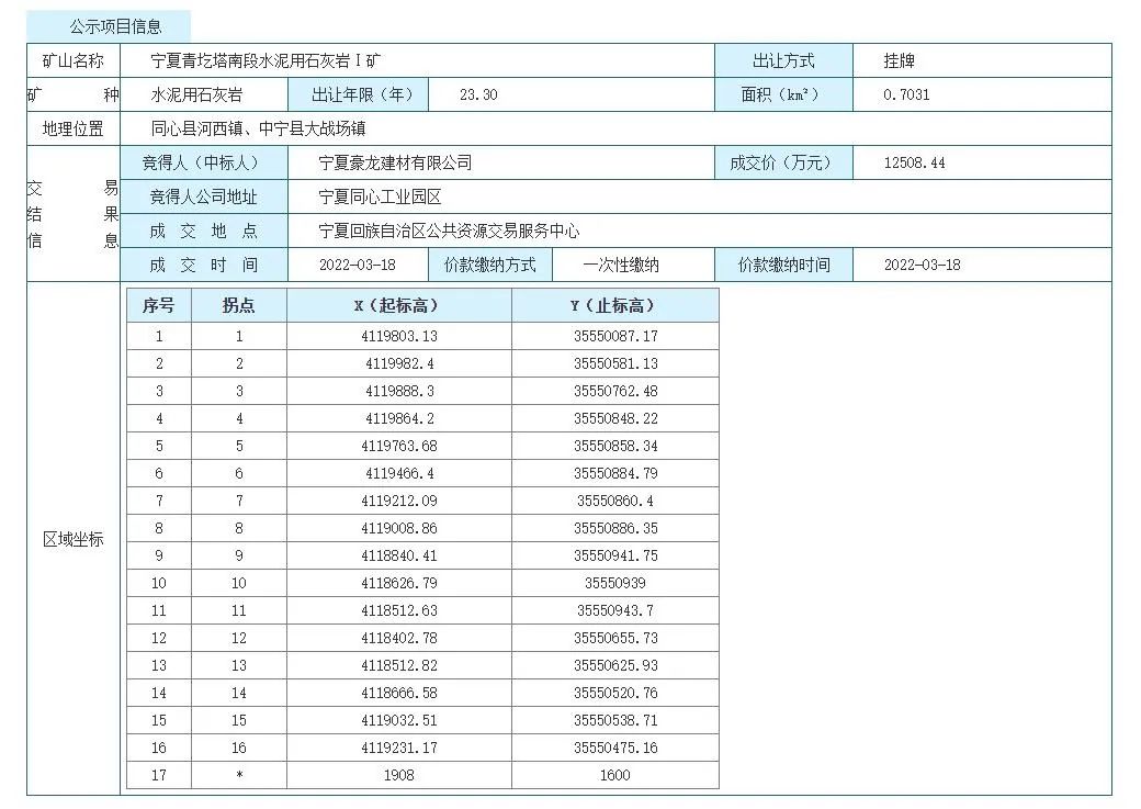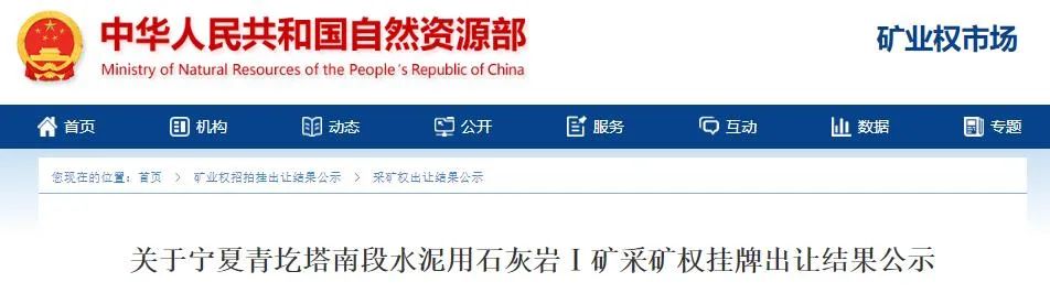 近日,自然資源部發(fā)布了關于寧夏青圪塔南段水泥用石灰?guī)rⅠ礦采礦權掛牌出讓結果公示。中國水泥網從公示中得知寧夏豪龍建材以1.25億元競得了該礦山采礦權。