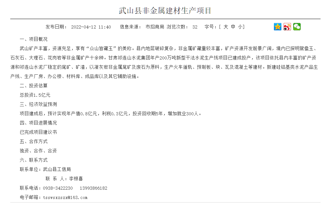 日前,甘肅天水市招商局發(fā)布了《武山縣非金屬建材生產(chǎn)項(xiàng)目》招商引資推介項(xiàng)目消息稱,甘肅祁連山水泥集團(tuán)年產(chǎn)200萬(wàn)噸新型干法水泥生產(chǎn)線項(xiàng)目已建成投產(chǎn),該項(xiàng)目依托縣內(nèi)豐富的礦產(chǎn)資源和祁連山水泥廠穩(wěn)定的尾礦、礦渣,以凝灰?guī)r非金屬尾礦及廢石為原料,生產(chǎn)火車道軌、預(yù)制板、塊、瓦及混凝土等建材。新建硅鋁基類水泥產(chǎn)品生產(chǎn)線、生產(chǎn)廠房、辦公樓、材料庫(kù)、成品庫(kù)以及其它輔助設(shè)施。