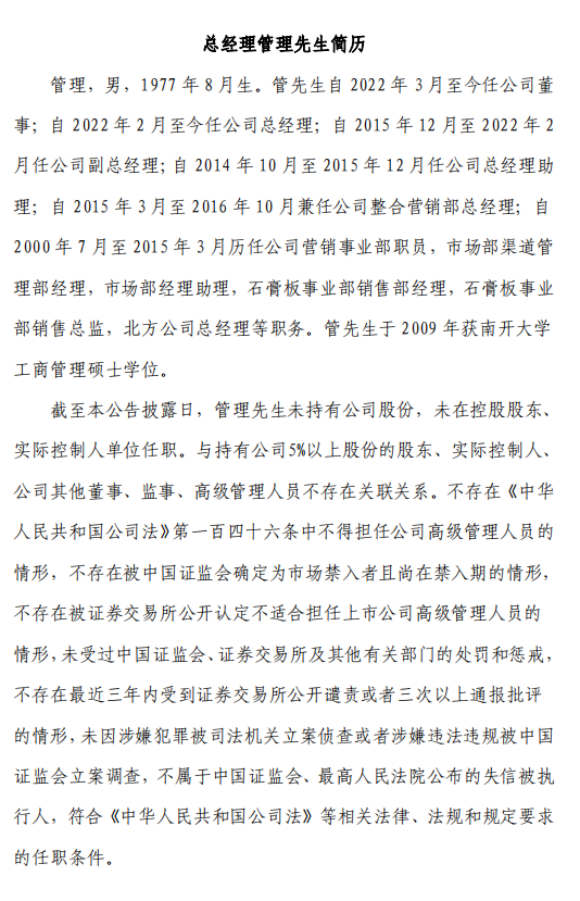 4月12日,北新建材發(fā)布第七屆董事會(huì)第一次會(huì)議決議公告稱(chēng),此次會(huì)議審議通過(guò)了《關(guān)于選舉公司第七屆董事會(huì)董事長(zhǎng)的議案》,同意選舉尹自波先生為公司第七屆董事會(huì)董事長(zhǎng),任期與第七屆董事會(huì)任期一致,自本次會(huì)議決議之日起生效。