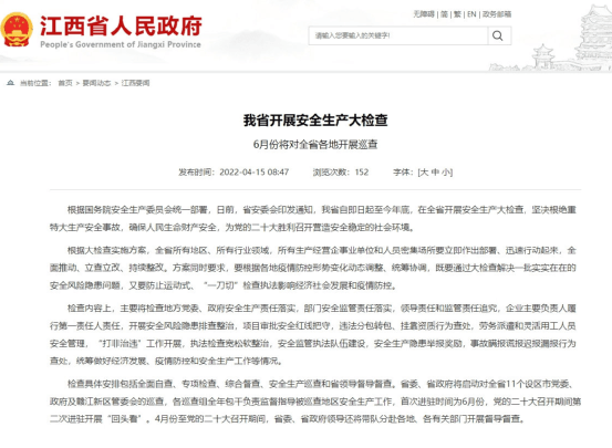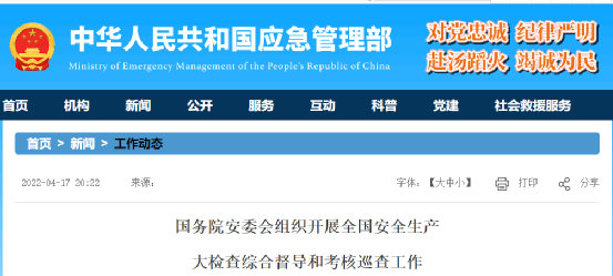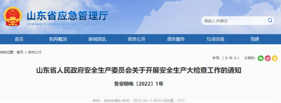 4月15日,山東省政府安委會印發《關于開展安全生產大檢查工作的通知》,決定自即日起至2022年12月31日,在全省范圍內開展安全生產大檢查,通知明確了企業、部門和各級黨委、政府重點檢查內容。