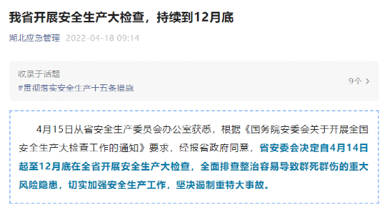 湖北省自4月14日起至12月底在全省開展安全生產大檢查