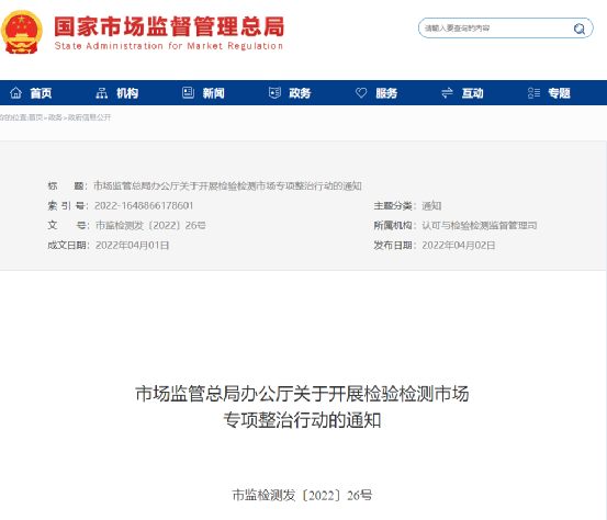 根據《市場監管總局辦公廳關于開展檢驗檢測市場專項整治行動的通知》(以下簡稱《通知》),為加強檢驗檢測機構監管,嚴肅查處不實和虛假檢驗檢測等違法違規行為,凈化檢驗檢測市場環境,市場監管總局決定于2022年4月至7月底開展檢驗檢測市場專項整治行動。