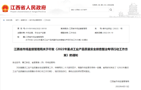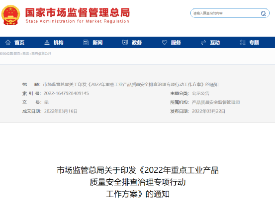 同時江西、福建、山東等省市自治區通知開展2022年重點工業產品質量安全排查整治專項行動。