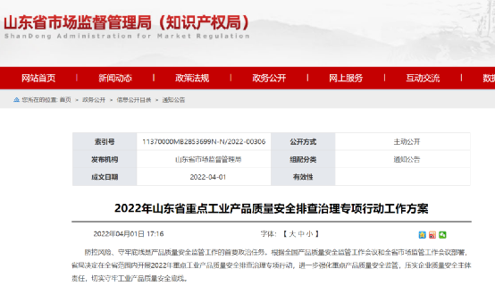 山東省市場監管局發布《2022年山東省重點工業產品質量安全排查治理專項行動工作方案》。根據全國產品質量安全監管工作會議和全省市場監管工作會議部署,省局決定在全省范圍內開展2022年重點工業產品質量安全排查治理專項行動。