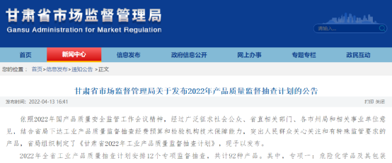 甘肅省市場監督管理局公布了《2022年工業產品質量省級監督抽查計劃》,2022年將安排12個專項監督抽查,共計92種產品。