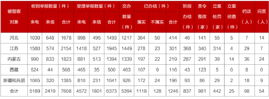 截至4月10日晚22:00,各督察組共收到群眾來電、來信舉報7608件,受理有效舉報6373件,經梳理合并重復舉報,累計向被督察對象轉辦5394件;被督察對象已辦結或階段辦結2083件,其中立案處罰442家;立案偵查25件;約談黨政領導干部98人,問責黨政領導干部54人。第二輪第六批中央生態環境保護督察邊督邊改情況匯總表。