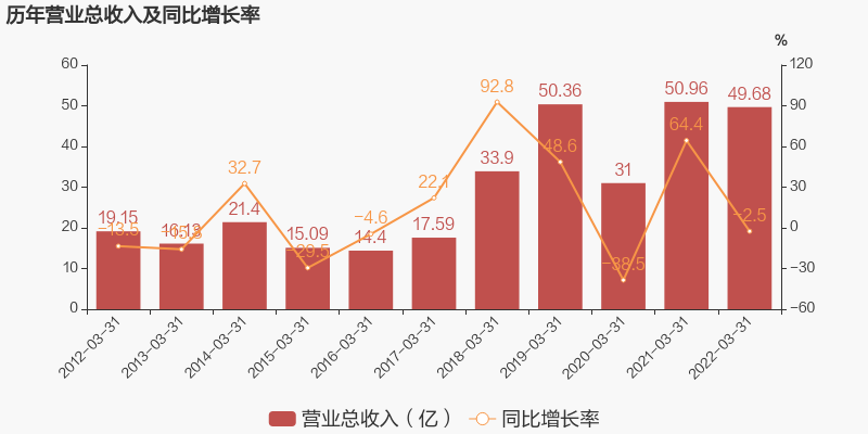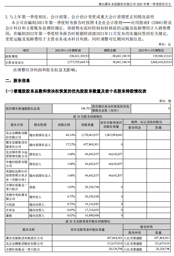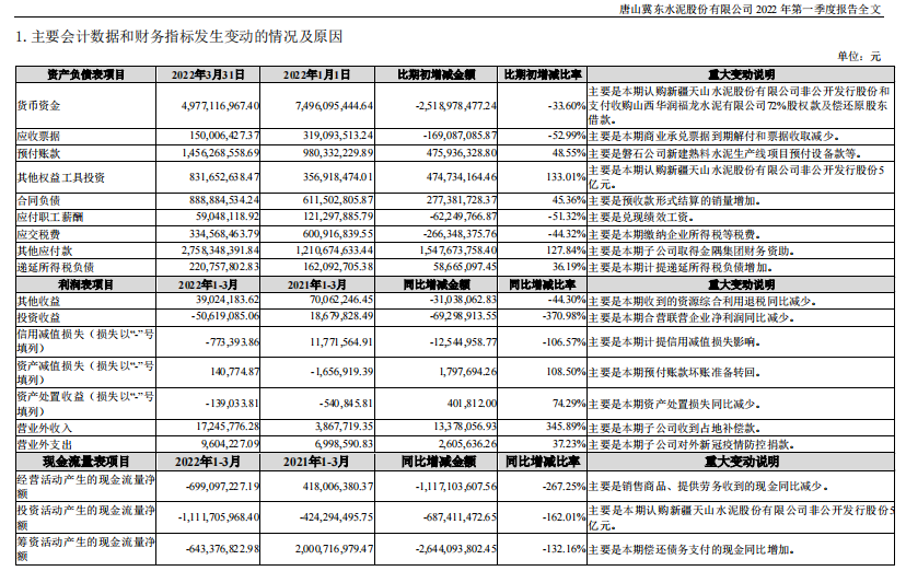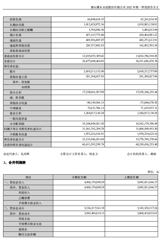冀東水泥于2022年4月20日披露一季報,公司2022年一季度實現營業總收入49.7億,同比下降2.5%;實現歸母凈利潤-2.3億,上年同期為-5148.6萬元,虧損幅度擴大。
