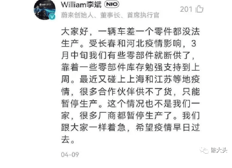 4月9日,蔚來汽車公開表示,蔚來位于吉林,上海,江蘇等地的供應鏈伙伴已經陸續停產,零部件無法到位,導致整車停止生產!