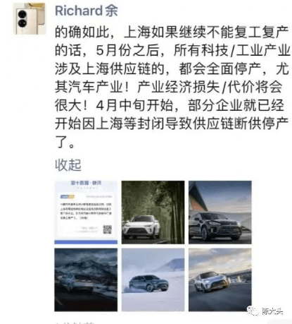 小鵬汽車董事長何小鵬在朋友圈發文稱,如果上海和周邊的供應鏈企業還無法找到動態復工復產的方式,五月份可能中國所有的整車廠都要停工停產了。