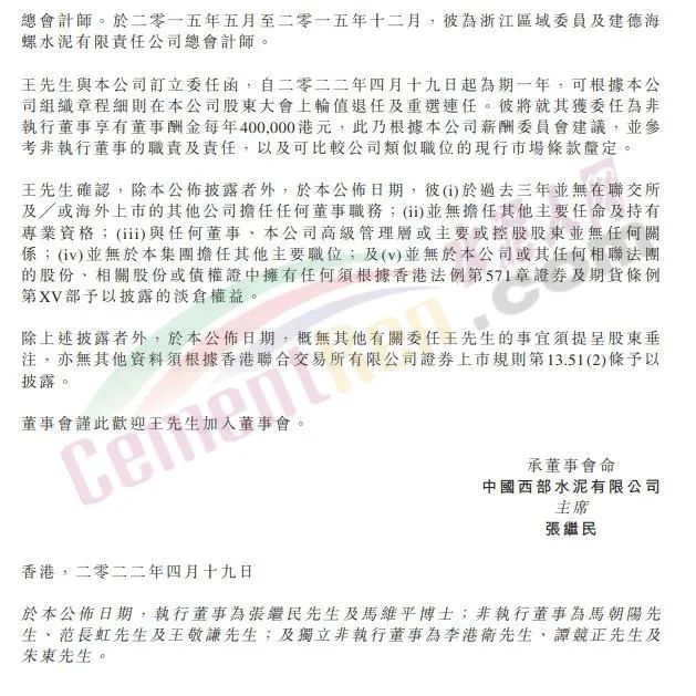 4月19日,西部水泥發布公告,侍光磊先生因調整工作安排而辭任非執行董事;王敬謙先生已獲委任為非執行董事,自2022年4月19日起生效。