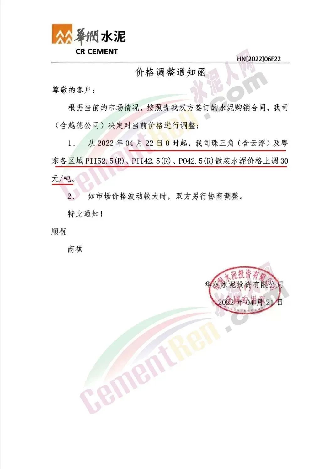 華潤水泥投資有限公司通知,自4月22日時起,公司珠三角(含云浮)及粵東各區域PII52.5(R)P.II42.5(R).PO42.5(R)散裝水泥價格上調30元/噸。