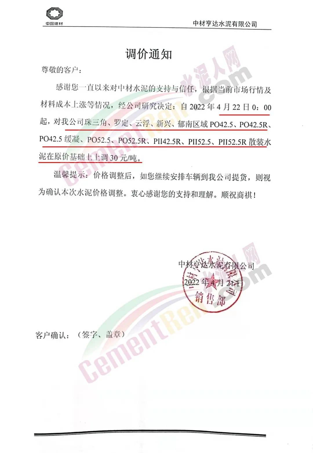 中材亨達水泥有限公司通知,根據當前市場行情及材料成本上漲等情況,經公司研究決定,自4月22日0時起對公司珠三角、羅定、云浮、郁南區域P.O42.5、P.O42.5R、P.O42.5緩凝、P.O52.5、P.O52.5R、PII42.5R、PII52.5、PII52.5R散裝水泥在原價基礎上上調30元/噸。