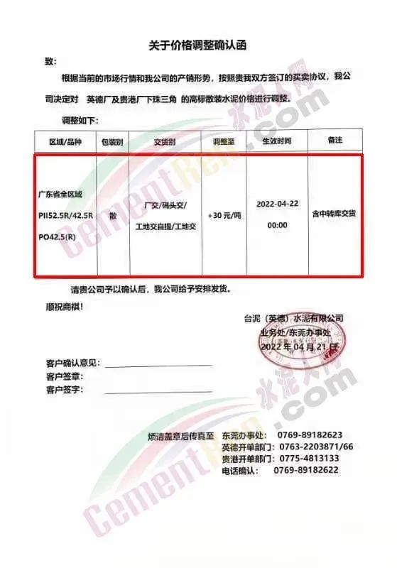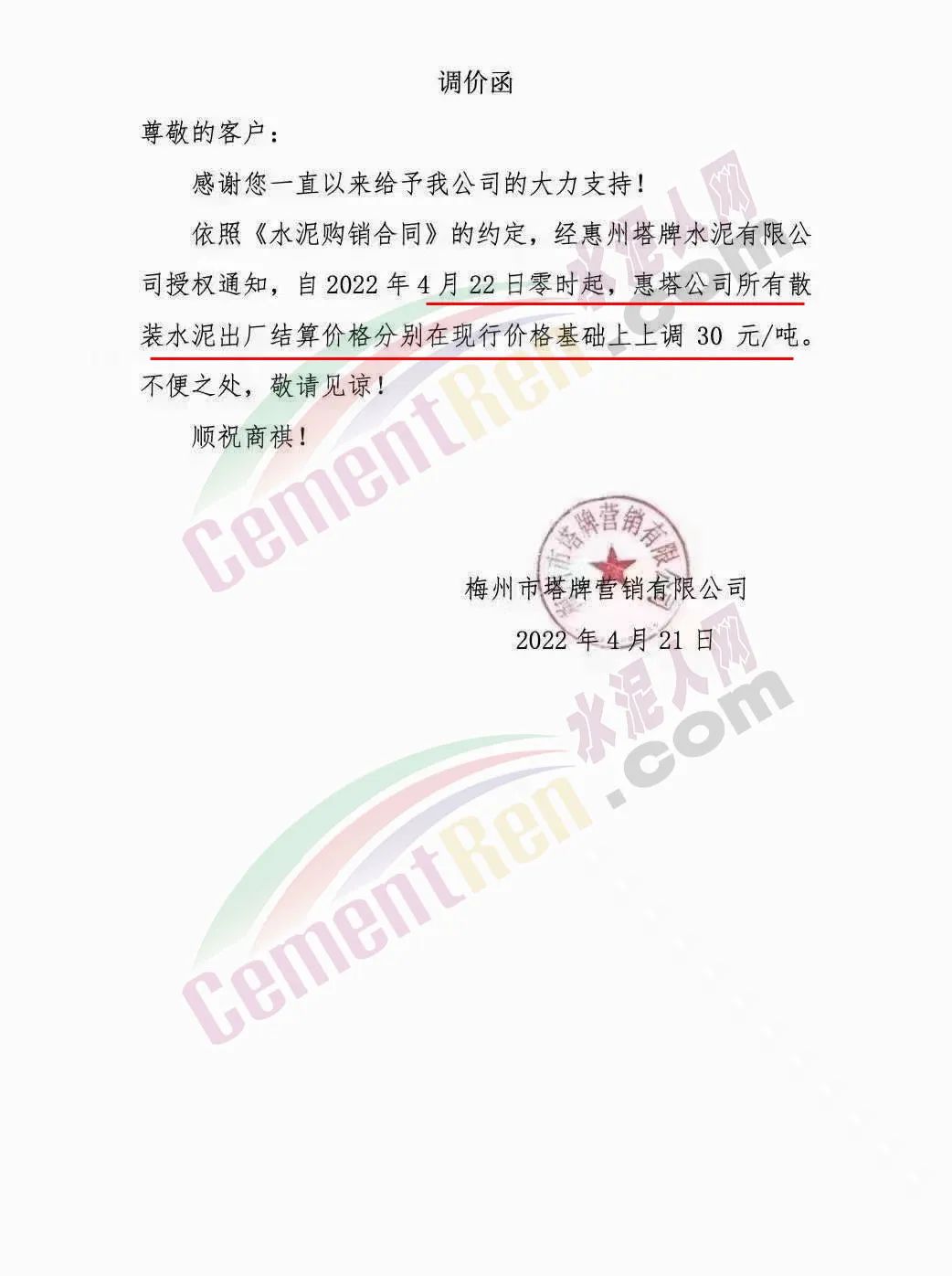 臺泥(英德)水泥有限公司業務處/東莞辦事處通知,根據當前的市場行情和公司的產銷形勢,從4月22日0時起廣東全區域PII52.5/42.5R、P.O42.5(R)水泥價格上漲30元/噸。梅州市塔牌營銷有限公司通知,經惠州塔牌水泥有限公司授權通知,自4月22日是0時起,惠塔公司所有散裝水泥出廠結算價格上調30元/噸。