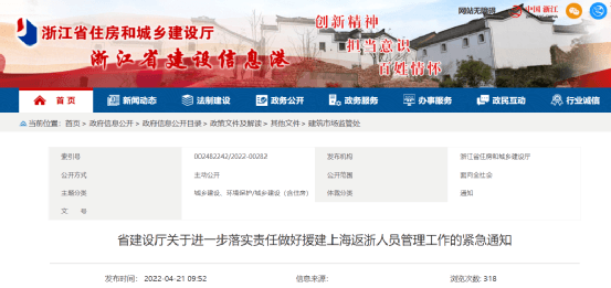2022年4月19日浙江省住房和城鄉建設廳發布《關于進一步落實責任做好援建上海返浙人員管理工作的緊急通知》提到,近期,在調研督查中發現,部分地市、單位還存在認識欠到位,一些企業管控主體責任還未落實,“四方責任”鏈條還未能全部貫通。為貫徹落實省委、省政府疫情防控決策部署,進一步落實責任做好援建上海返浙人員管理工作,發出緊急通知。