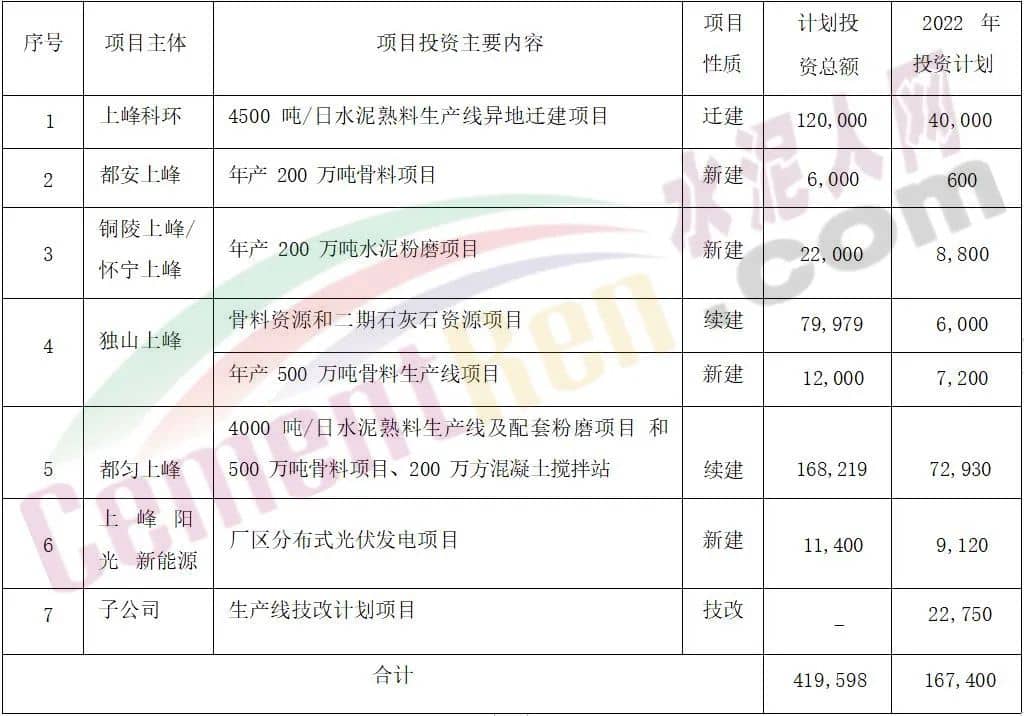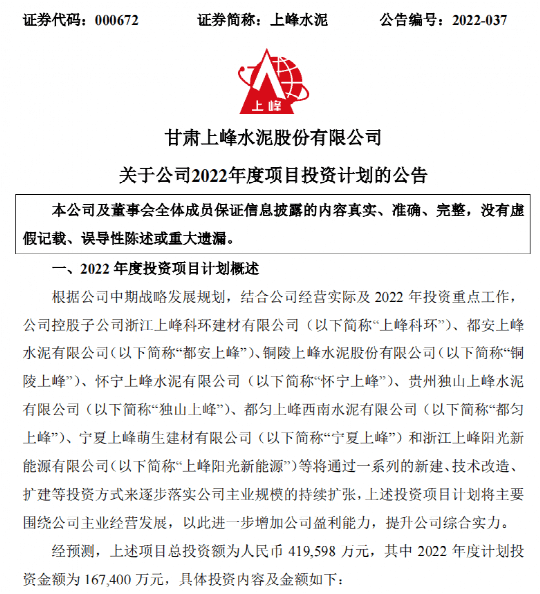 4月26日晚間,甘肅上峰水泥股份有限公司發(fā)布《關(guān)于公司2022年度項(xiàng)目投資計劃的公告》稱,根據(jù)公司中期戰(zhàn)略發(fā)展規(guī)劃,結(jié)合公司經(jīng)營實(shí)際及 2022 年投資重點(diǎn)工作,公司控股子公司浙江上峰科環(huán)建材有限公司、都安上峰水泥有限公司、銅陵上峰水泥股份有限公司、懷寧上峰水泥有限公司、貴州獨(dú)山上峰水泥有限公司、都勻上峰西南水泥有限公司、寧夏上峰萌生建材有限公司和浙江上峰陽光新能源有限公司等將通過一系列的新建、技術(shù)改造、 擴(kuò)建等投資方式來逐步落實(shí)公司主業(yè)規(guī)模的持續(xù)擴(kuò)張,上述投資項(xiàng)目計劃將主要圍繞公司主業(yè)經(jīng)營發(fā)展,以此進(jìn)一步增加公司盈利能力,提升公司綜合實(shí)力。經(jīng)預(yù)測,上述項(xiàng)目總投資額為人民幣419,598萬元,其中2022年度計劃投資金額為167,400 萬元。