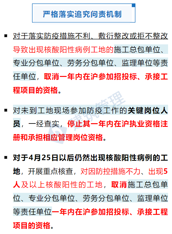 對于落實防疫措施不利、敷衍整改或拒不整改導致出現核酸陽性病例工地的施工總包單位、專業分包單位、勞務分包單位、監理單位等責任單位,取消一年內在滬參加招投標、承接工程項目的資格。對未到工地現場參加防疫工作的關鍵崗位人員,一經查實,停止其一年內在滬執業資格注冊和承擔相應管理崗位資格。