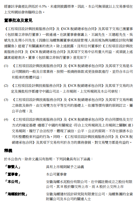 SCR脫硝技改服務,2022年4月29日,本公司與海螺設計院簽署《SCR脫硝總承包合同》,根據該合同,海螺設計院將為本公司若干子公司之熟料生產線提供SCR脫硝技術改造服務,注合同價格為人民幣12,750萬元(約相當于港幣15,118萬元)。