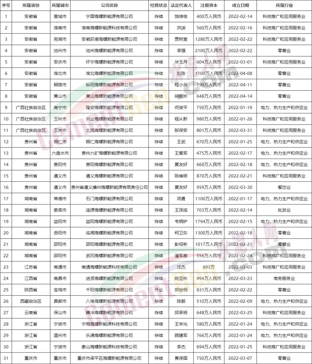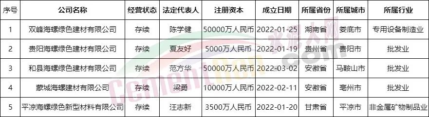 據水泥人網信息中心數據,今年以來海螺水泥以“海螺新能源”為企業名稱注冊的企業達31家,以“海螺綠色建材”為名稱的企業5家,以“海螺控股有限公司”為名稱的區域企業3家,以“海螺光伏科技”為企業名稱的企業兩家。詳情如下: