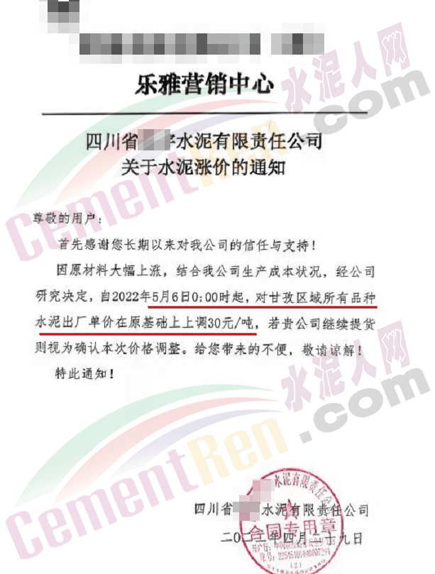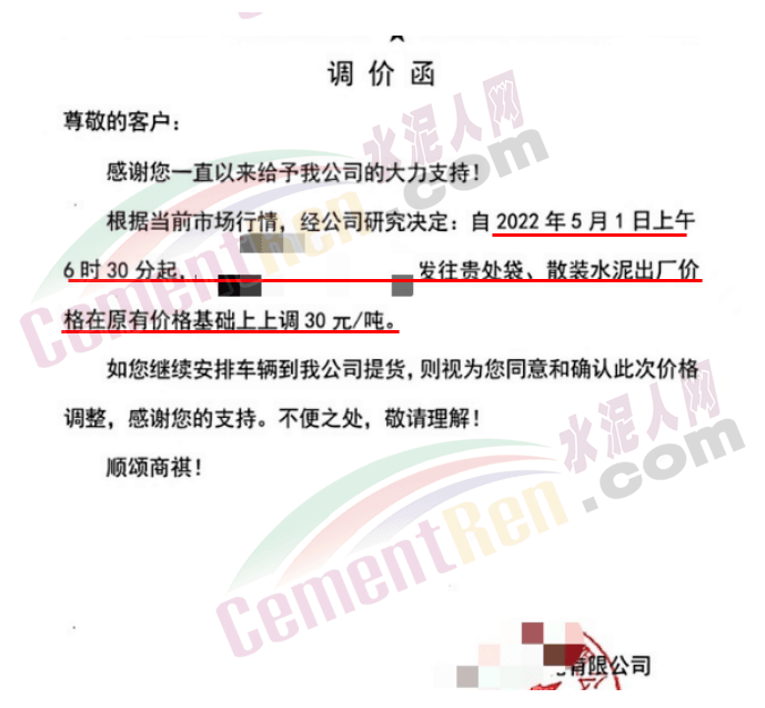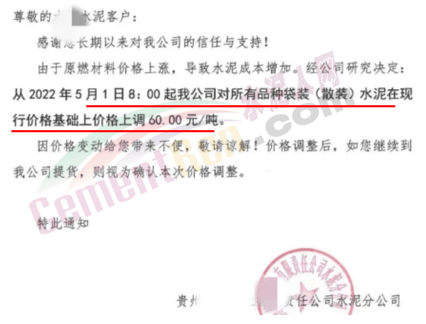 貴州部分水泥企業(yè)通知由于原燃材料價格上漲,經(jīng)公司研究決定從5月1日8時起上調(diào)水泥價格60元/噸。