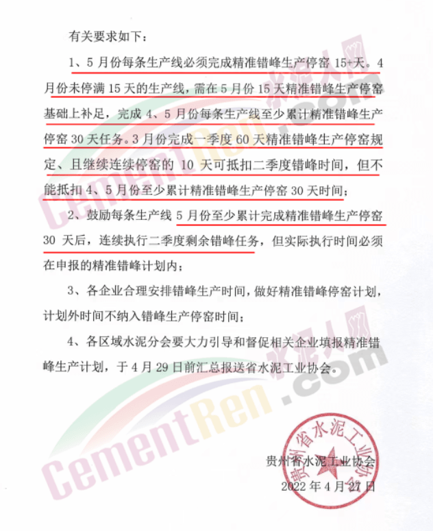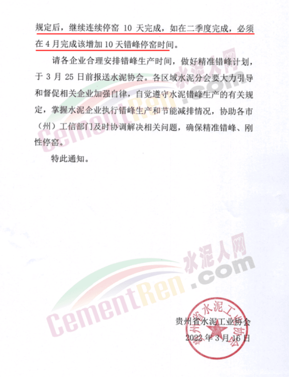 在貴州省工業和信息化廳、省生態環境廳《關于做好2022年度水泥行業錯峰生產的通知》與省水泥工業協會《關于延長2022年二季度水泥行業錯峰生產時間的通知》規定二季度每條生產線錯峰生產停窯40天基礎上再增加5天錯峰生產停窯時間,既二季度每條生產線精準錯峰生產共計45天。有關要求如下∶