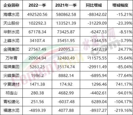 截至目前,絕大多數水泥上市公司都已發布了2022年一季度報告。從營業收入和業績來看,絕大多數企業業績未達預期。而近期各大企業陸續發布的一季度報告可見,絕大多數企業利潤環比下滑,其中福建水泥虧損4859.39萬元,同比下滑達219.16%。亞泰集團歸母凈利潤-4.57億元,冀東水泥歸母凈利潤-2.3億,西藏天路歸母凈利潤-5644.83萬元,虧損幅度擴大。