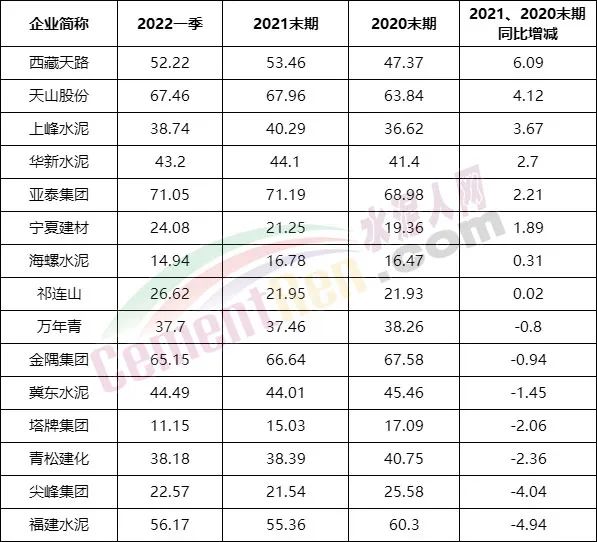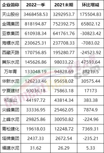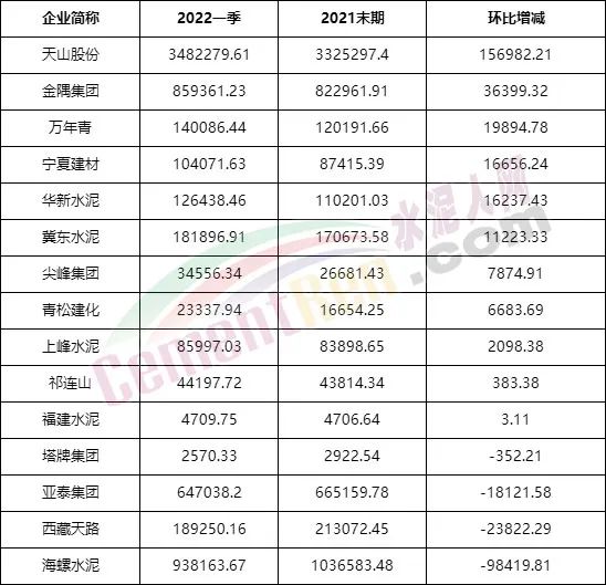 應收賬款及票據方面,天山股份、金隅集團、萬年青、寧夏建材、華新水泥、冀東水泥、尖峰集團、青松建化、上峰水泥、祁連山、福建水泥等企業2022年一季度較上看末期環比均有不同幅度的增加。