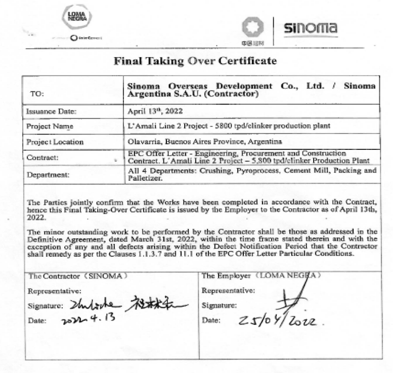 近日,中材海外工程有限公司總承包的“阿根廷L’Amali二號線日產5800噸水泥熟料生產線項目”正式獲得業主Loma Negra簽發的最終TOC證書,該證書生效日期為4月13日。