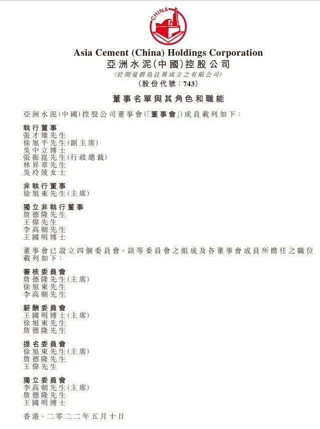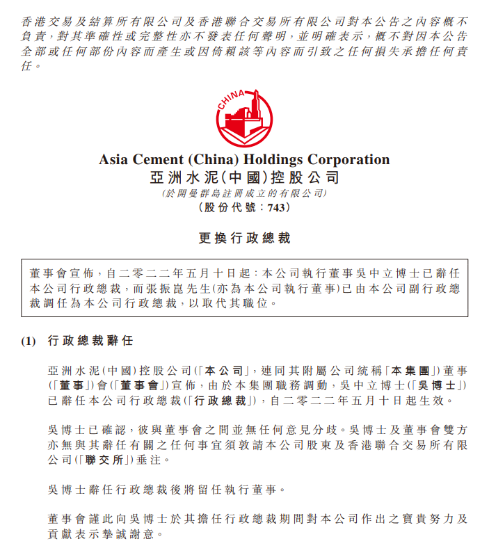 亞洲水泥(中國)發(fā)布公告,自2022年5月10日起:公司執(zhí)行董事吳中立博士已辭任公司行政總裁,而張振昆先生(亦為公司執(zhí)行董事)已由公司副行政總裁調(diào)任為公司行政總裁,以取代其職位。