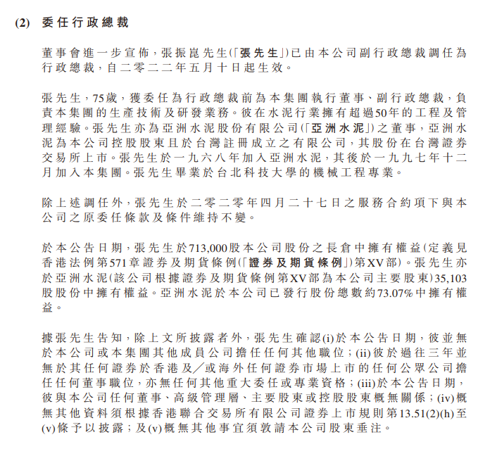 張先生亦為臺灣上市公司亞洲水泥集團之董事。
