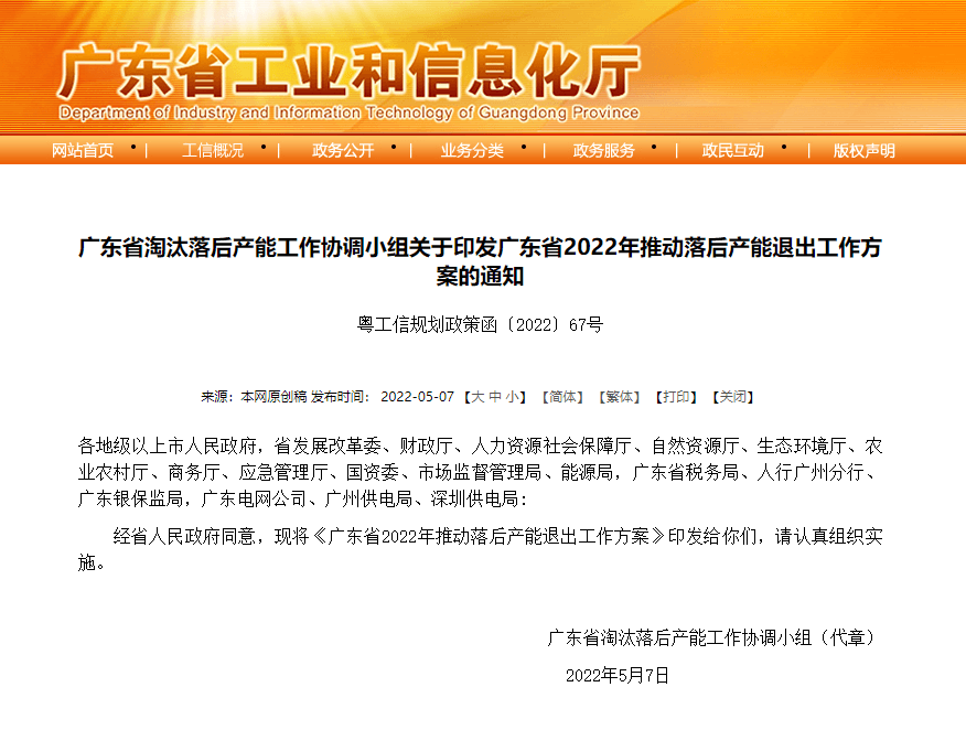 日前,廣東省工信廳發布2022年推動落后產能退出工作方案,要求以鋼鐵、水泥、電解鋁、平板玻璃等行業為重點,通過完善綜合標準體系,嚴格常態化執法和強制性標準實施,落實部門聯動和地方責任,深入推進市場化、法治化、常態化工作機制,促使一批能耗、環保、安全、技術達不到標準和生產不合格產品或淘汰類產能,依法依規關停退出。