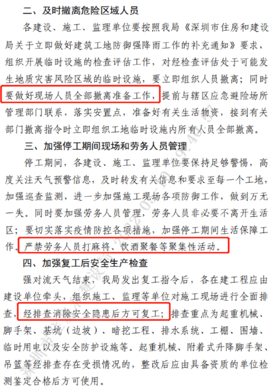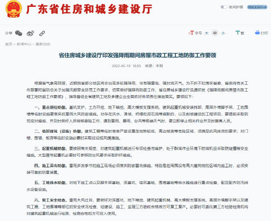 廣東省住建廳發布《強降雨期間房屋市政工程工地防御工作要領》其中提到,對重點部位進行防御,基坑支護、土方開挖、地下暗挖、高大模板支撐系統、建筑起重機械安裝拆卸、高層外墻腳手架、工地圍墻等臨時設施要落實抗雷雨大風防御措施。對存在洪水、滑坡、坍塌和泥石流等威脅的,以及削坡建設的工程項目,要提前采取防范應對措施,并及時做好人員轉移避險工作,遇到雷雨、暴雨、臺風等極端天氣時,要立即停止相關作業并及時撤離人員。