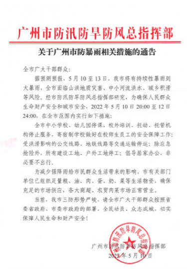 5月10日晚,廣州市防汛防旱防風總指揮部發布通知,要求10日起至12日24:00,廣州所有建筑工地、戶外工地停工。