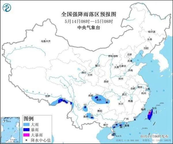 中央氣象臺5月14日06時發布暴雨藍色預警:預計,5月14日08時至15日08時,四川盆地南部、重慶南部、貴州北部、云南東北部、西藏東南部、廣東西南部和東部沿海、海南島東北部、臺灣島等地部分地區有大到暴雨,其中,臺灣島西北部局地有大暴雨(100~120毫米)。