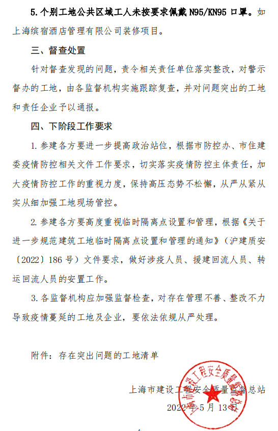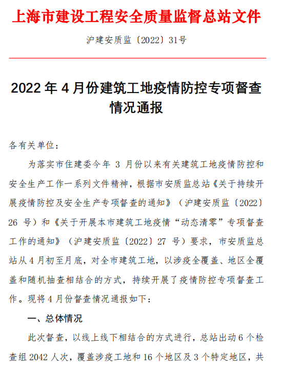5月13日,上海市安質監總站發布《2022年4月份建筑工地疫情防控專項督查情況通報》稱,為落實市住建委3月份以來有關建筑工地疫情防控和安全生產工作一系列文件精神,根據相關文件要求,市安質監總站從4月初至月底,對全市建筑工地,以涉疫全覆蓋、地區全覆蓋和隨機抽查相結合的方式,持續開展了疫情防控專項督查工作。 此次督查,以線上線下相結合的方式進行,總站出動6個檢查組2042人次,覆蓋涉疫工地和16個地區及3個特定地區,共計督查工地971個次(含復查)。