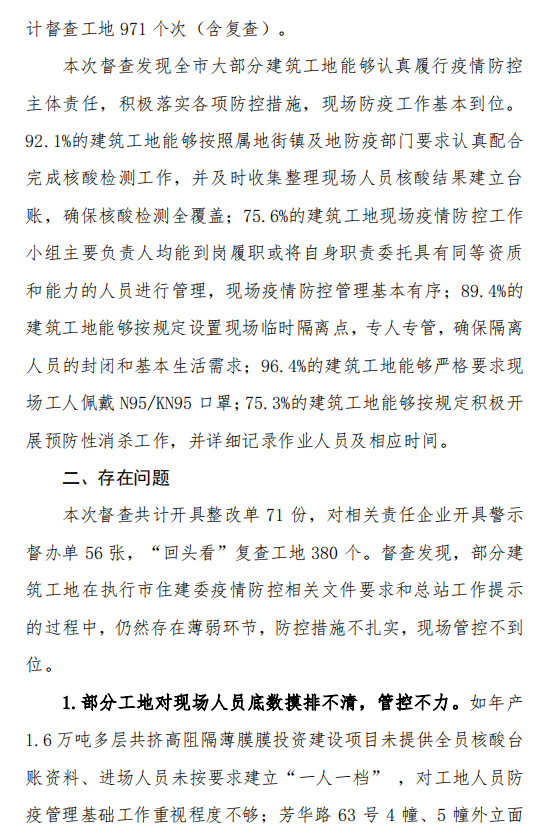 本次督查共計開具整改單71份,對相關責任企業開具警示督辦單56張,“回頭看”復查工地380個。督查發現,部分建筑工地在執行市住建委疫情防控相關文件要求和總站工作提示的過程中,仍然存在薄弱環節,防控措施不扎實,現場管控不到位。