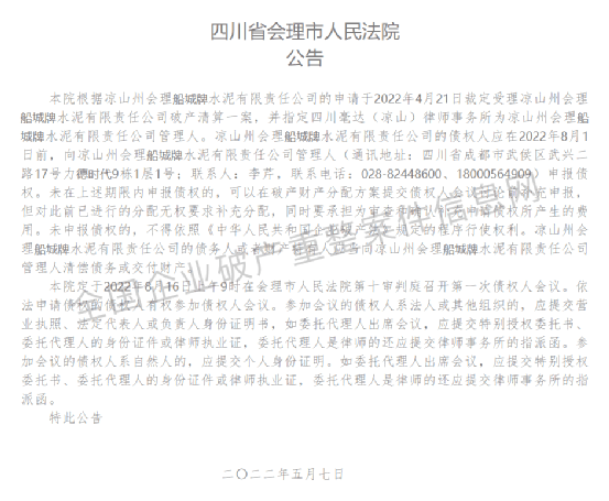 5月7日四川省會理市人民法院公告,根據涼山州會理船城牌水泥有限責任公司的申請于2022年4月21日裁定受理涼山州會理船城牌水泥有限責任公司破產清算一案,并指定四川毫達(涼山)律師事務所為涼山州會理船城牌水泥有限責任公司管理人。