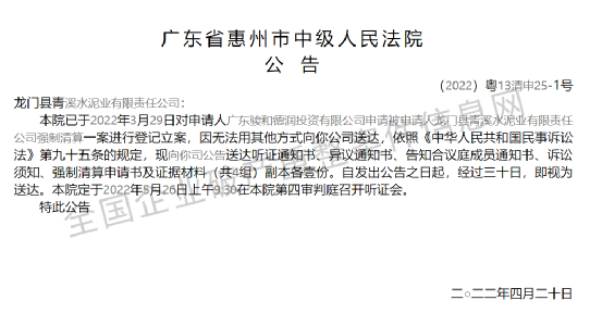 4月20日廣東省惠州市中級人民法院發布公告稱,法院已于2022年3月29日對申請人廣東駿和德潤投資有限公司申請被申請人龍門縣青溪水泥業有限責任公司強制清算一案進行登記立案,因無法用其他方式向龍門縣青溪水泥業有限責任公司送達,依照《中華人民共和國民事訴訟法》第九十五條的規定,現向其公告送達聽證通知書、異議通知書、告知合議庭成員通知書、訴訟須知、強制清算申請書及證據材料(共4組)副本等。