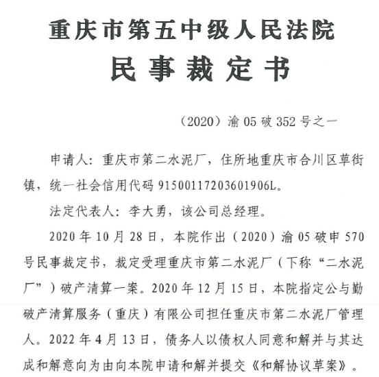 4月19日重慶市第五中級人民法院民事裁定書顯示,重慶市第二水泥廠在法院受理破產申請后,宣告破產。債務人提出的和解協議草案載明了清償債務的資金來源、清償比例、期限等,符合法律規定。予以準許。