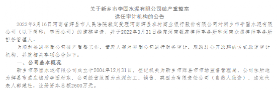 4月8日新鄉李固水泥有限公司管理人發布《關于新鄉市李固水泥有限公司破產重整案選任審計機構的公告》稱,2022年3月16日河南省輝縣市人民法院裁定受理河南輝縣農村商業銀行股份有限公司對新鄉市奪固水泥有限公司的重整申請,并指定管理人。為順利推進奪固公司破產重整工作,管理人需對李固公司進行財務審計,并公開選聘的方式逸定審計機構。