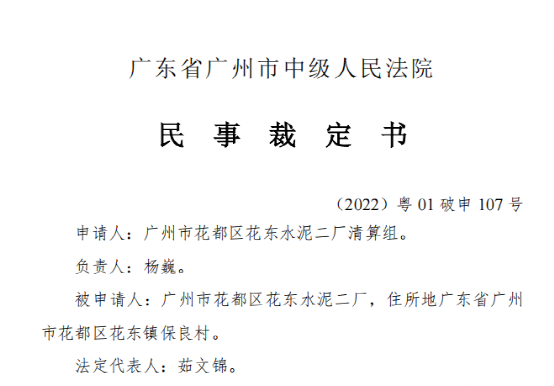 4月8日廣東省廣州市中級人民法院發布民事裁定書提到,受理廣州市花都區花東水泥二廠清算組對廣州市花都區花東水泥二廠的破產清算申請。