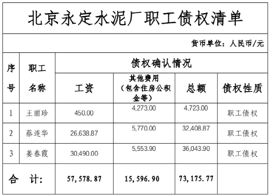 3月14日,北京永定水泥廠管理人發布了《北京永定水泥廠破產清算案職工債權的第二次公示》,公示附表顯示,北京永定水泥廠三名職工債權總額為73175.77元。