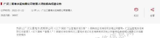 1月22日,廣漢三星堆水泥有限公司管理人發布《評估機構招募公告》稱,為轉讓廣漢三星堆水泥有限公司擁有的土地使用權及地上附著物,廣漢三星堆水泥有限公司管理人擬委托評估機構對三星堆水泥公司土地使用權及地上附著物進行評估。